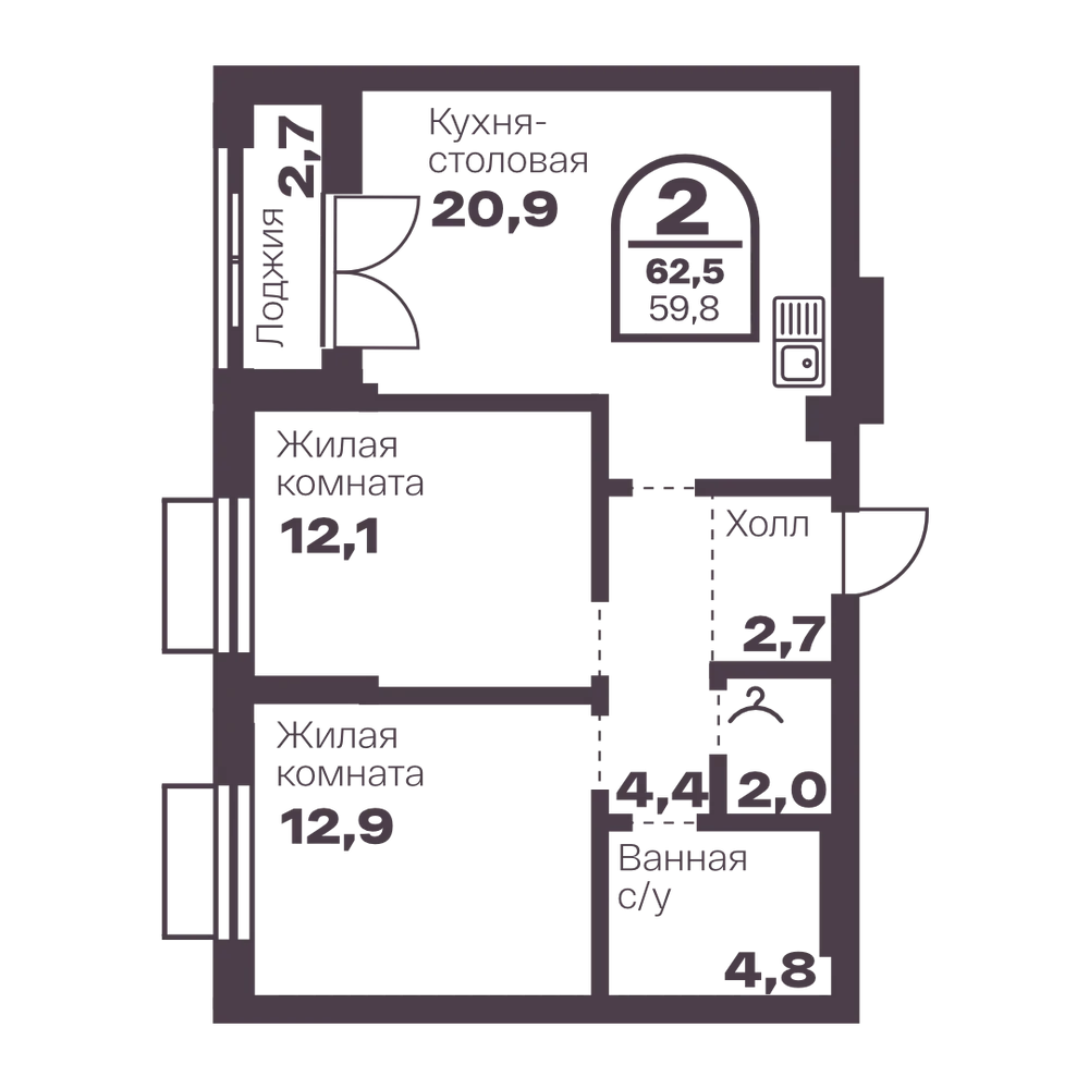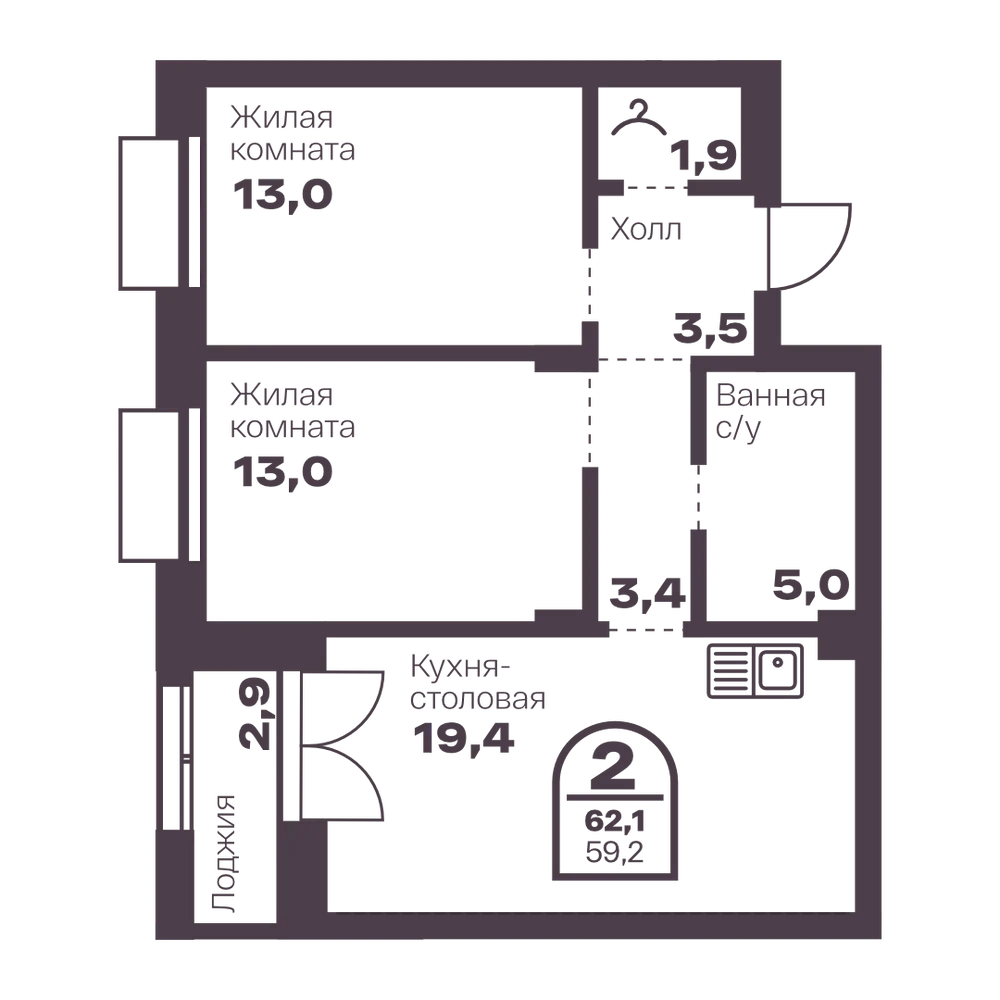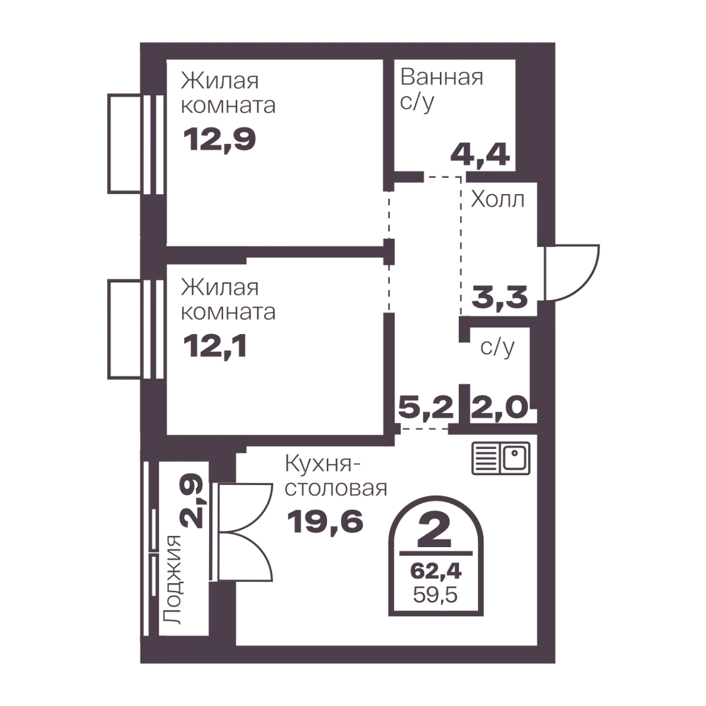 2-комнатная 55.8 м