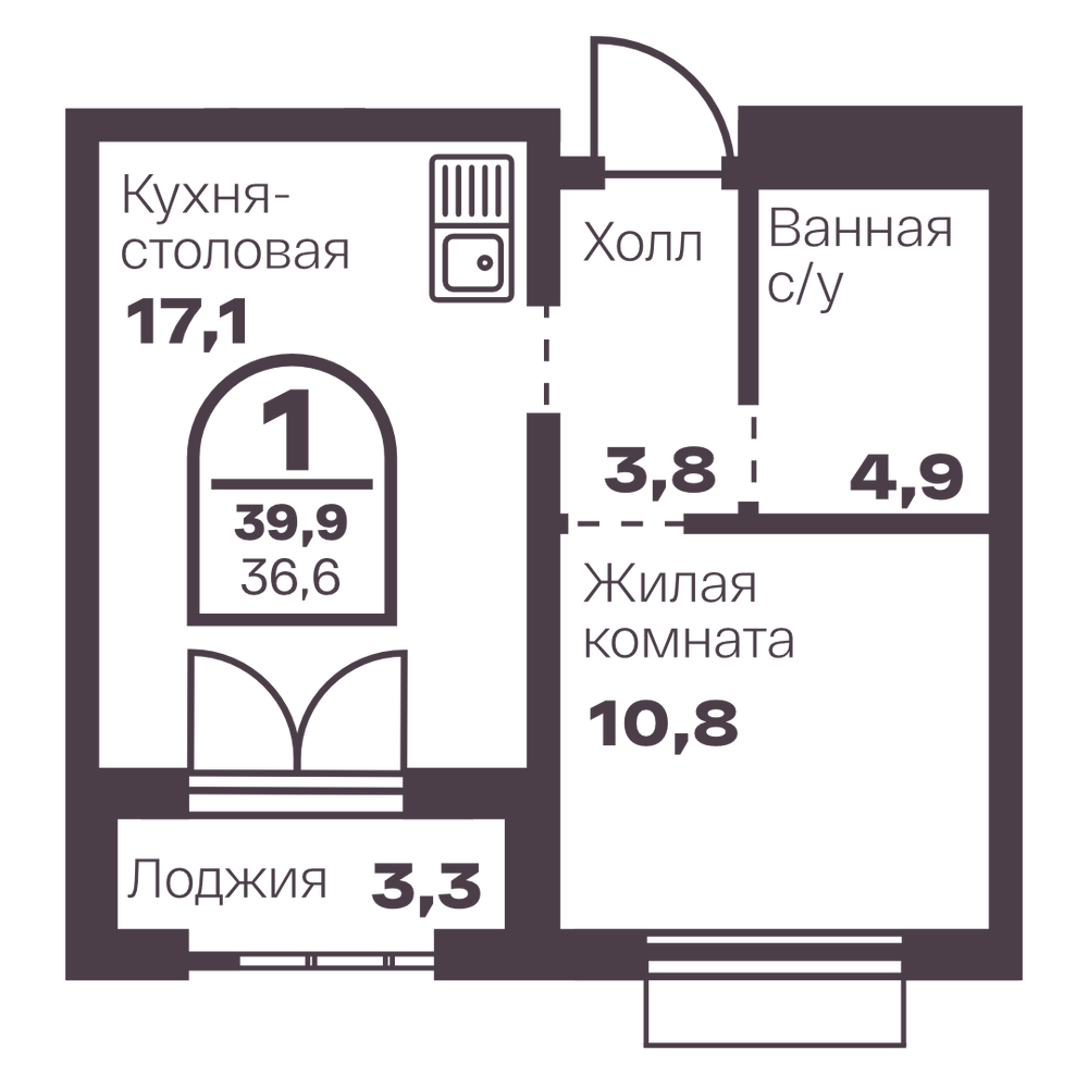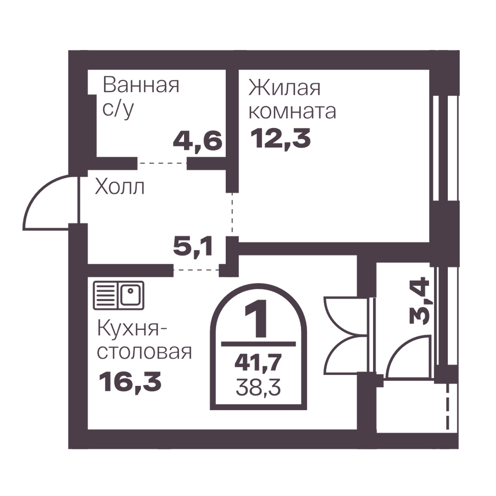 1-комнатная 38.3 м