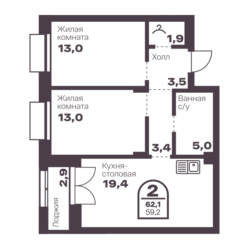 2-комнатная 59.4 м